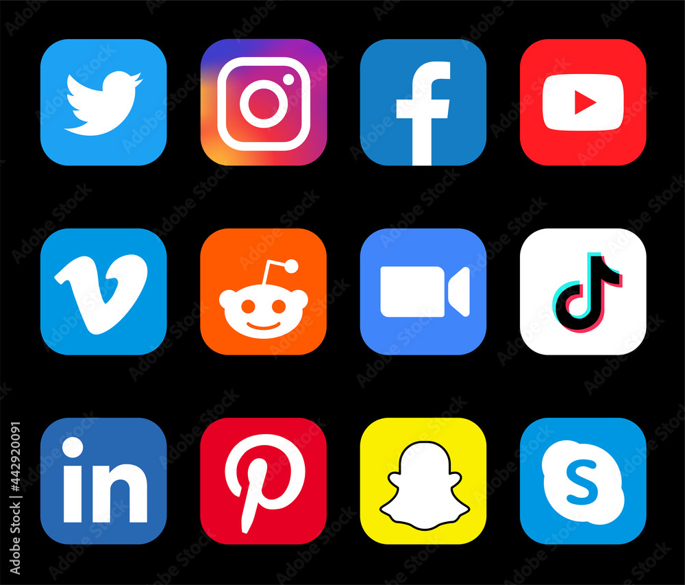 Twitter Instagram Facebook Youtube Vimeo Reddit Zoom Tiktok Linkedin Pinterest Snapchat Skype Social Media Icon Set Vector Illustration Stock Vector Adobe Stock